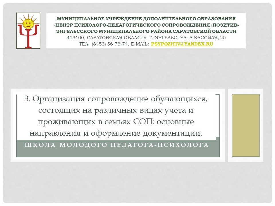 12 ноября 2025 года в МУ ДО "Центр" Позитив состоялся плановый обучающий семинар для молодых специалистов в "Школе молодого педагога-психолога" на тему "Организация и психологическое сопровождение обучающихся, состоящих на различных видах учета (в КДН, ПДН, внутришкольном)". Александрова Ольга Ивановна, педагог-психолог, обозначила основные направления и формы работы школьного педагога-психолога с детьми, замеченными в проявлении девиантного поведения, а также проинформировала о необходимости оформления соответствующей документации, подтверждающей осуществление данного вида деятельности.